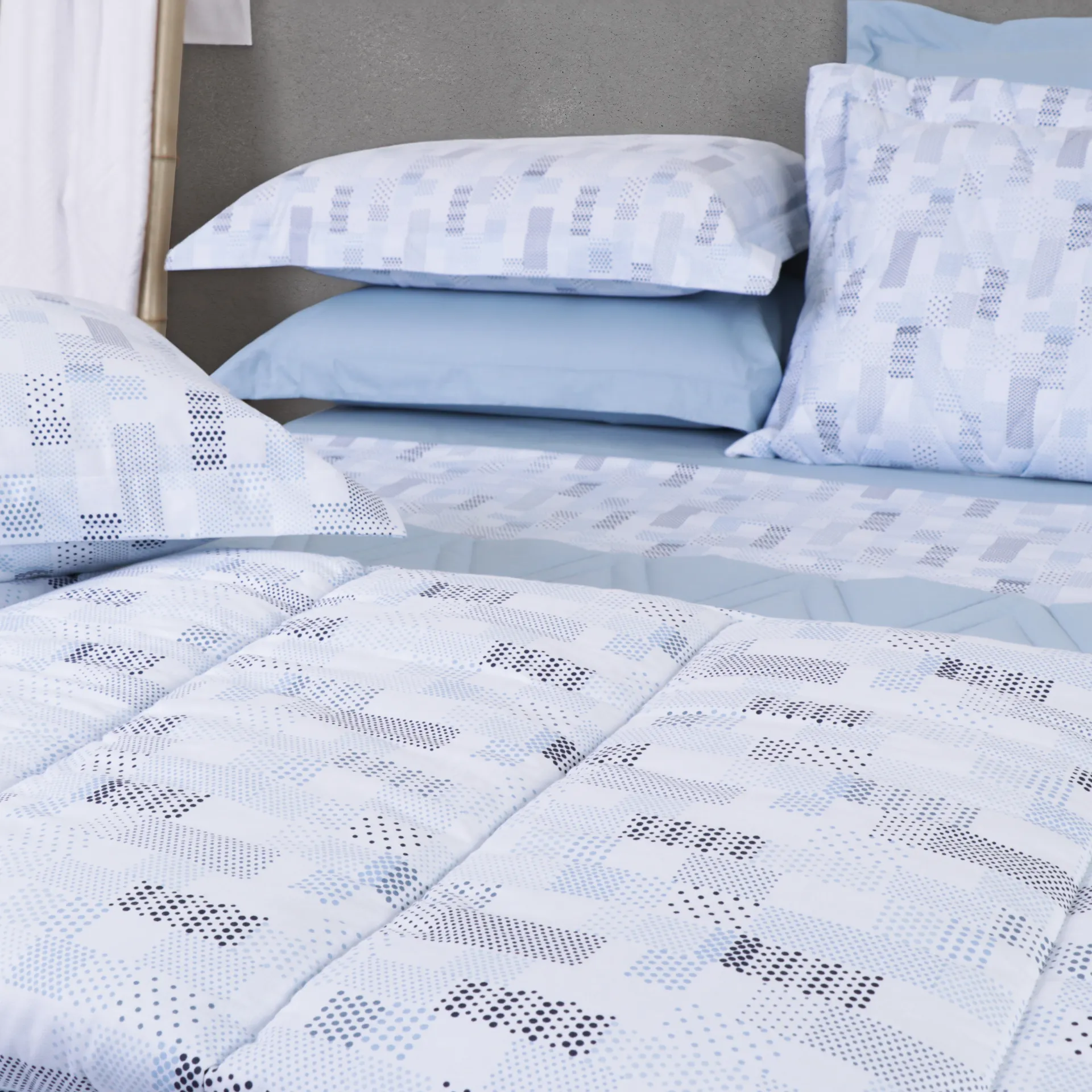Com estampa suave e moderna, esse jogo de cama traz leveza e elegância ao ambiente, tornando suas noites mais relaxantes.